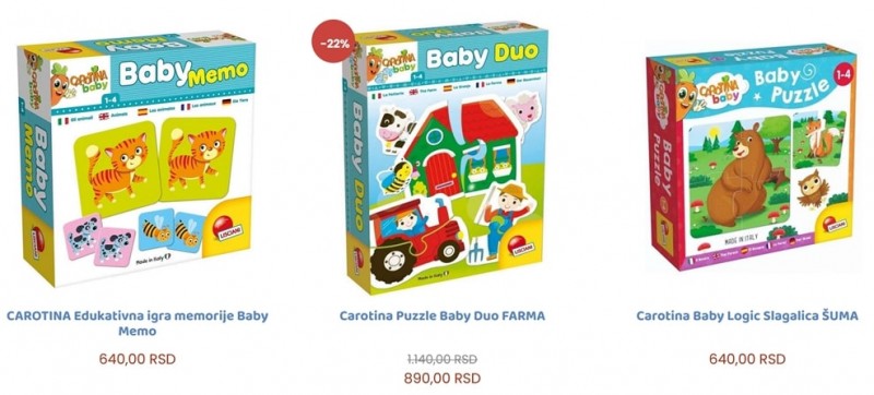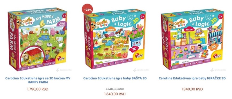 Carotina edukativne igre su specijalno osmišeljene da Vaše dete kroz igru vežba mnoge veštine: motoriku, logiku i percepciju. Imaju razne teme: životinje, svet oko nas, ljudsko telo, crtanje i još mnogo toga. Zaista savršeni setovi ako želite da se Vaše dete zaigra i nauči nešto novo.
