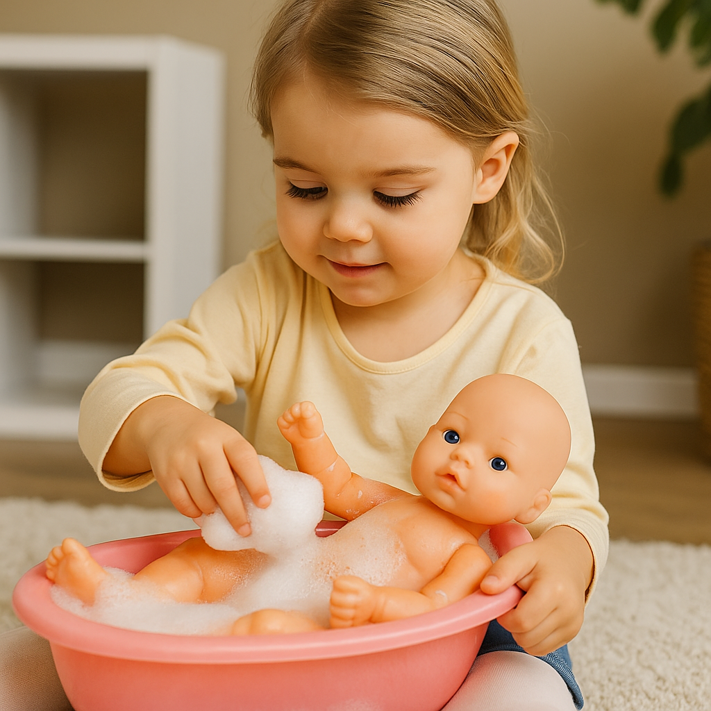 Set sa bebom i kadicom donosi zabavu kroz igru kupanja, hranjenja i brige o lutki – savršen za male negovatelje koji žele da uče kroz igru.