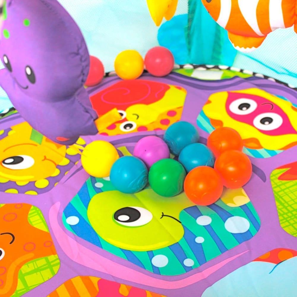 Mekana gimnastika za bebe u obliku morske kornjače s dva križna luka sadrži 4 viseće igračke koje se mogu ukloniti i koristiti zasebno. Prostirka se lako pretvara u mini igralište! Samo podignite mrežaste stranice i dobićete ogradicu sa lopticama. U glavi kornjače se kriju loptice za igru koje će ludo zabaviti Vašeg bebca!