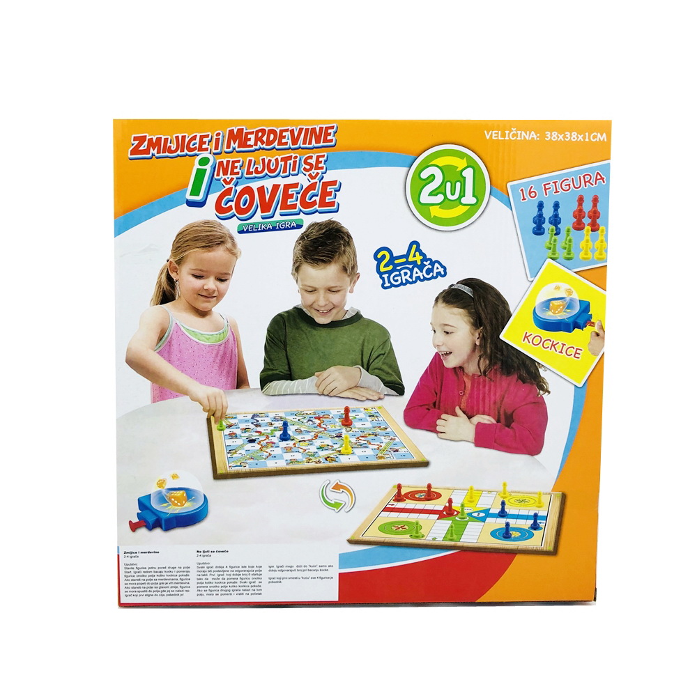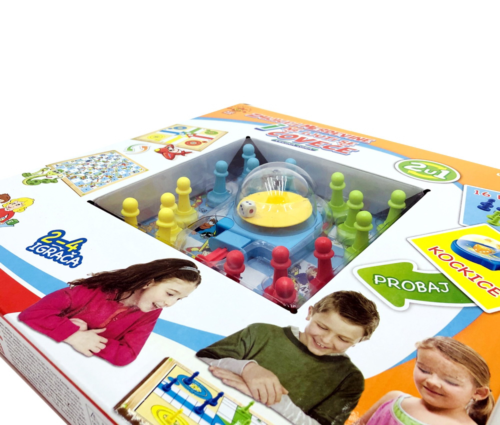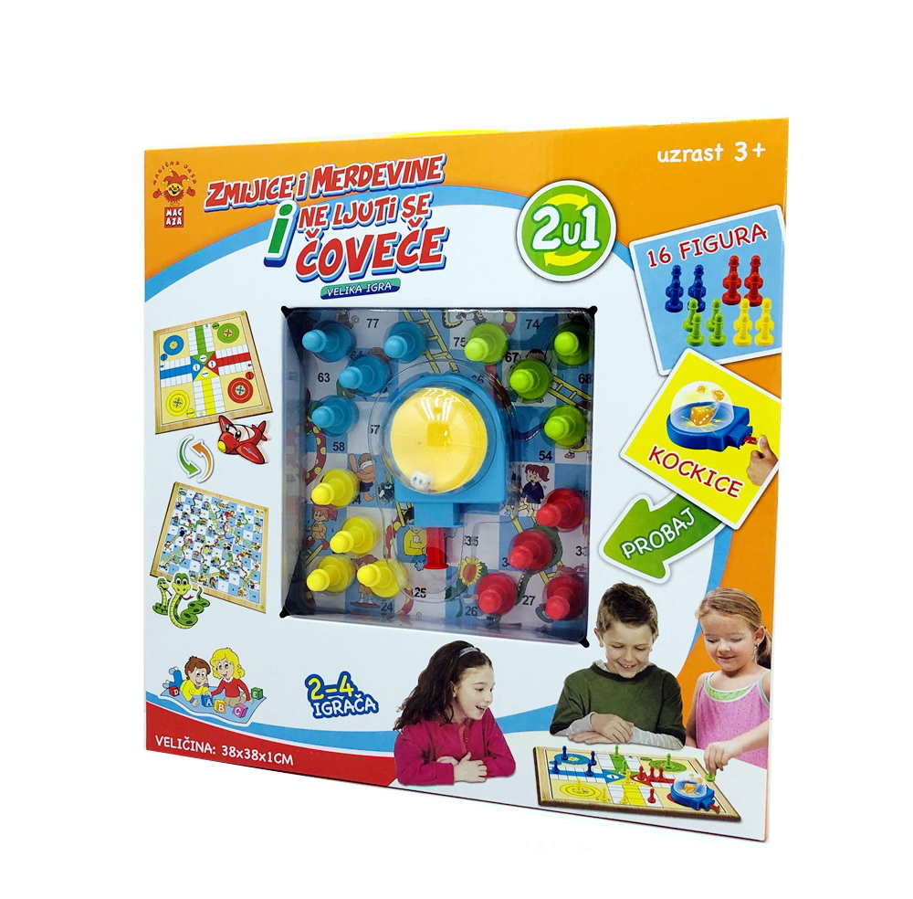U sredini table imate bazu unutar koje se nalazi kockica. Guranjem specijalnog nastavka baza počinje da se vrti i kockica prosto leti unutar kupole dok ne padne! Neverovatno zabavno, jedva ćete čekati svoj red! Ali ni to nije sve! Sa druge strane table imate igru Zmijice i merdevine koju svi vole. Sjajna zabava za decu i odrasle! Puno sreće i bez ljutnje!
