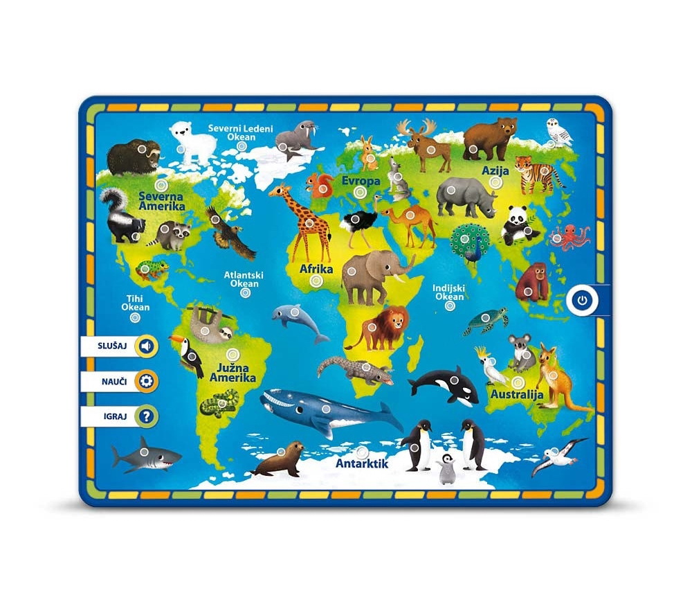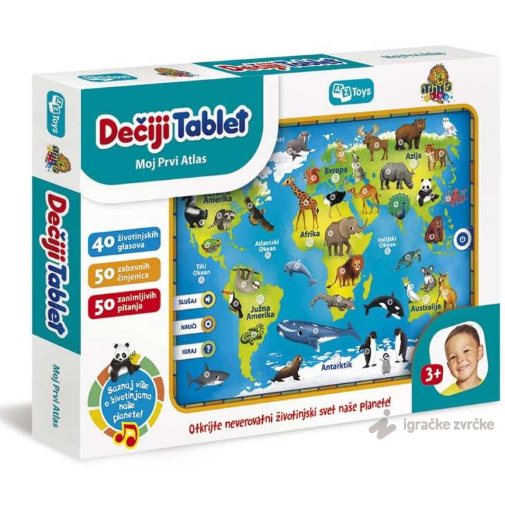 Mi imamo savršeno rešenje za Vas! Sjajan Dečiji tablet Moj Prvi Atlas koji nema ekran i radi na principu igračke na dodir, proizvodi zvukove i drži dete zainteresovanim. Zanimljive životinje koje su nacrtne kriju dugme osetljivo na dodir pa pritiskom na životinju možete čuti njen zov i saznati nešto korisno. Pored toga što čuva oči Vašeg deteta, korišćenjem ovog tableta za decu sprečava mogućnost da Vaše dete gleda neprimeren sadržaj ili da nešto bitno izbriše. Moj Prvi Atlas tablet za decu ima ugrađenih:
