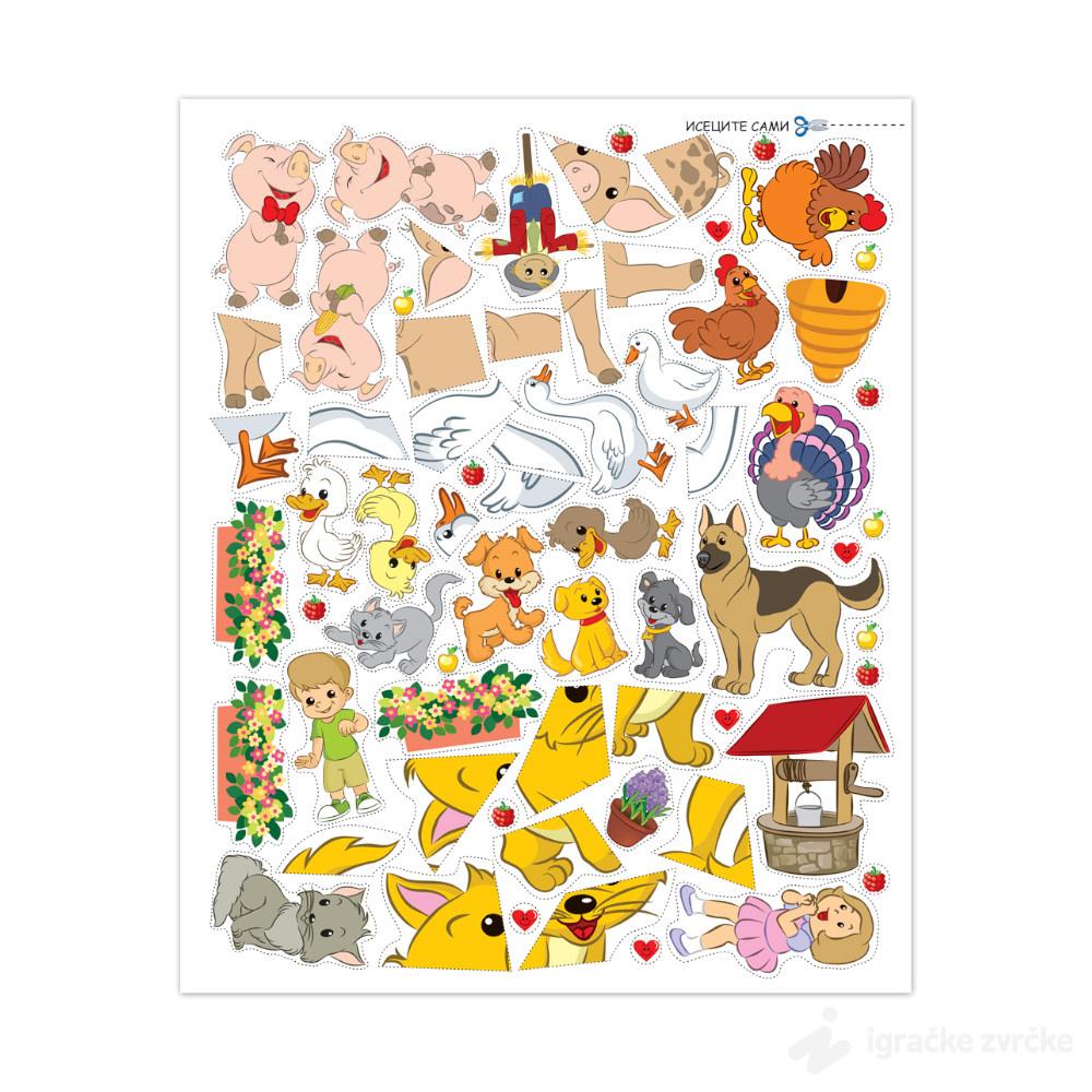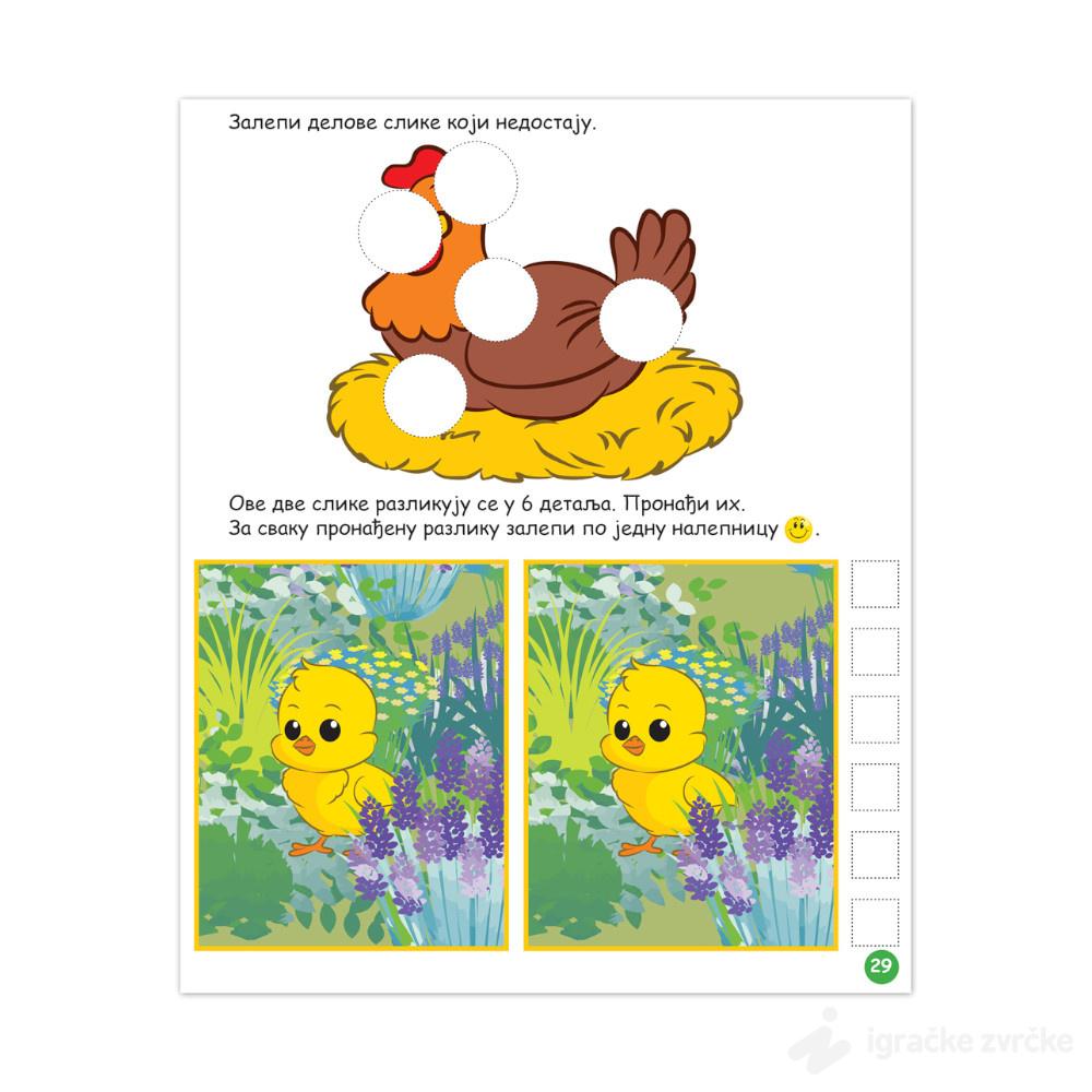 Prošetaj kroz cvetne livade, šume i dvorišta. Pomozi ovcama i mačkama da pronađu svoju mladunčad, ulepšaj seosko domaćinstvo lepeći nalepnice, pomozi pilićima da pronađu svoje cvetove, sastavi slagalice životinja, pronađi kućice kuca i pomozi im da reše svoje nedoumice, dovrši logičke nizove, otkrij životinje koje su se ušunjale kod patke i guske, pomozi zekama da izbroje šargarepe i još mnogo toga!