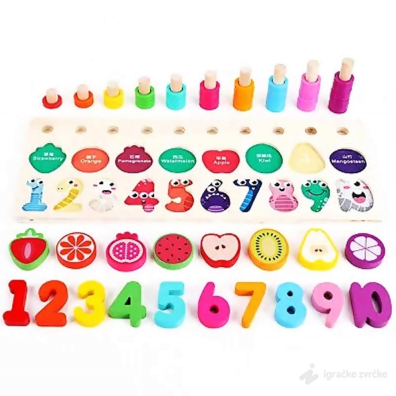 U setu dobijate drvenu tablu, drvene brojeve i voćkice, drvene štapiće i plastične krugove. Dete treba da uklopi broj i voćkicu u odgovarajuće udubljenje, a da na štapiće naređa onoliko krugova koliki je broj ispod njega. Zabavno i poučno!