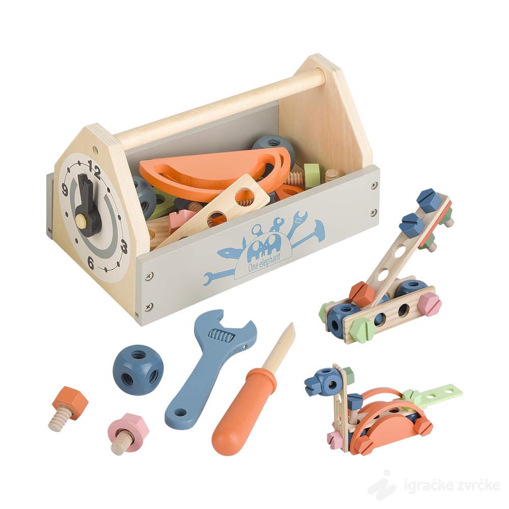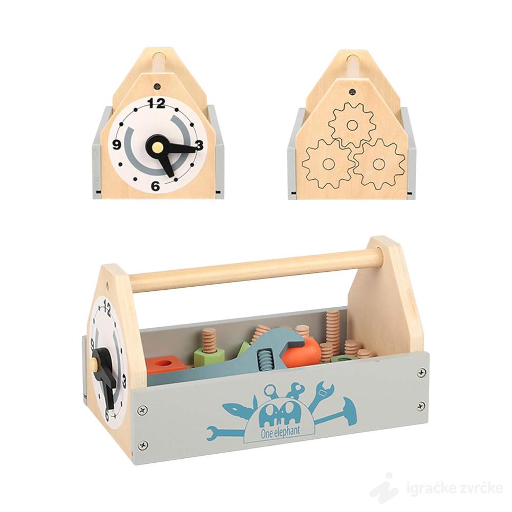 • Drvena kutija puna alata za kreativnu igru i razvoj veština