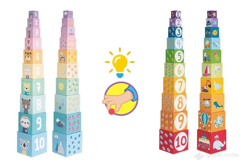 Dizajn kocki je posebna priča. Na svakoj imate razne životinje i aplikacije. Takođe, imate napisane brojeve, pa možete kroz igru detetu približiti brojanje. Uz svaki broj imate i toliko životinja da ih dete broji.