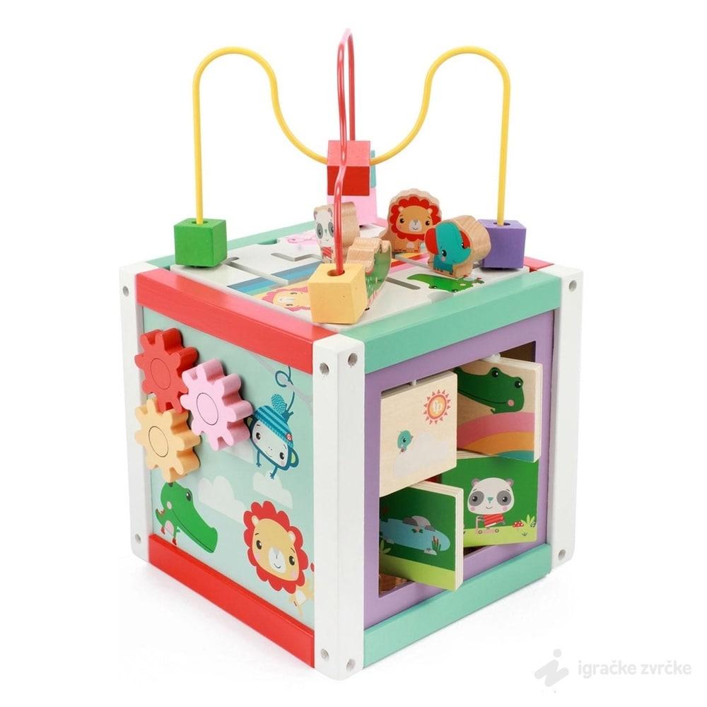Kocka ima 5 različitih strana sa aktivnostima i bazu. Svaka strana je pažljivo i kreativno dizajnirana i traži od deteta nov način igre. Gornji deo, koji se može ukloniti, dolazi sa rolerkosterom sa velikim perlama i slagalicom.