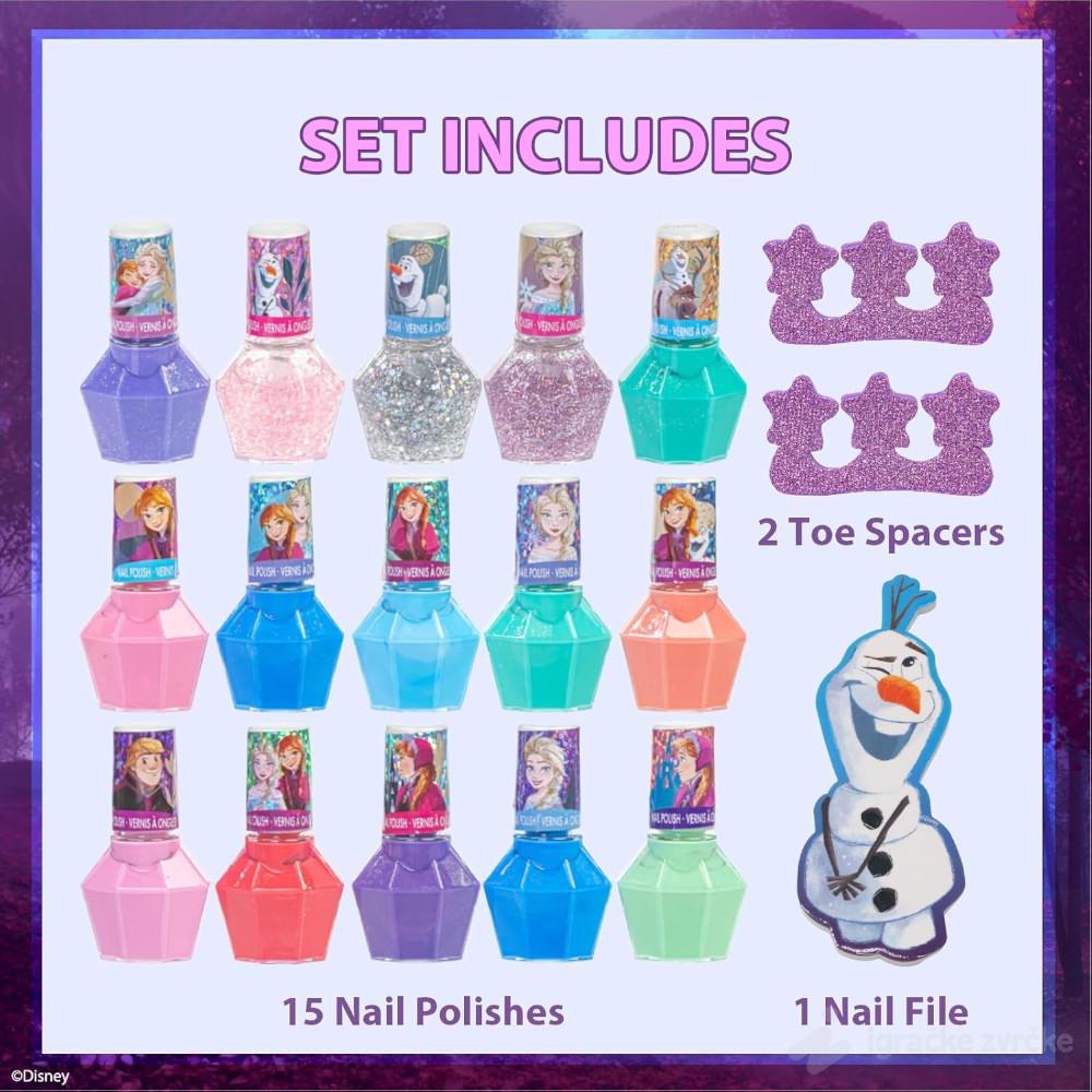Frozen set lakova za nokte namenjen je devojčicama koje vole boje, igru i omiljene Disney junake. Set sadrži čak 15 različitih lakova u atraktivnim nijansama, kao i dodatke koji čine manikir zabavnim i lakim.