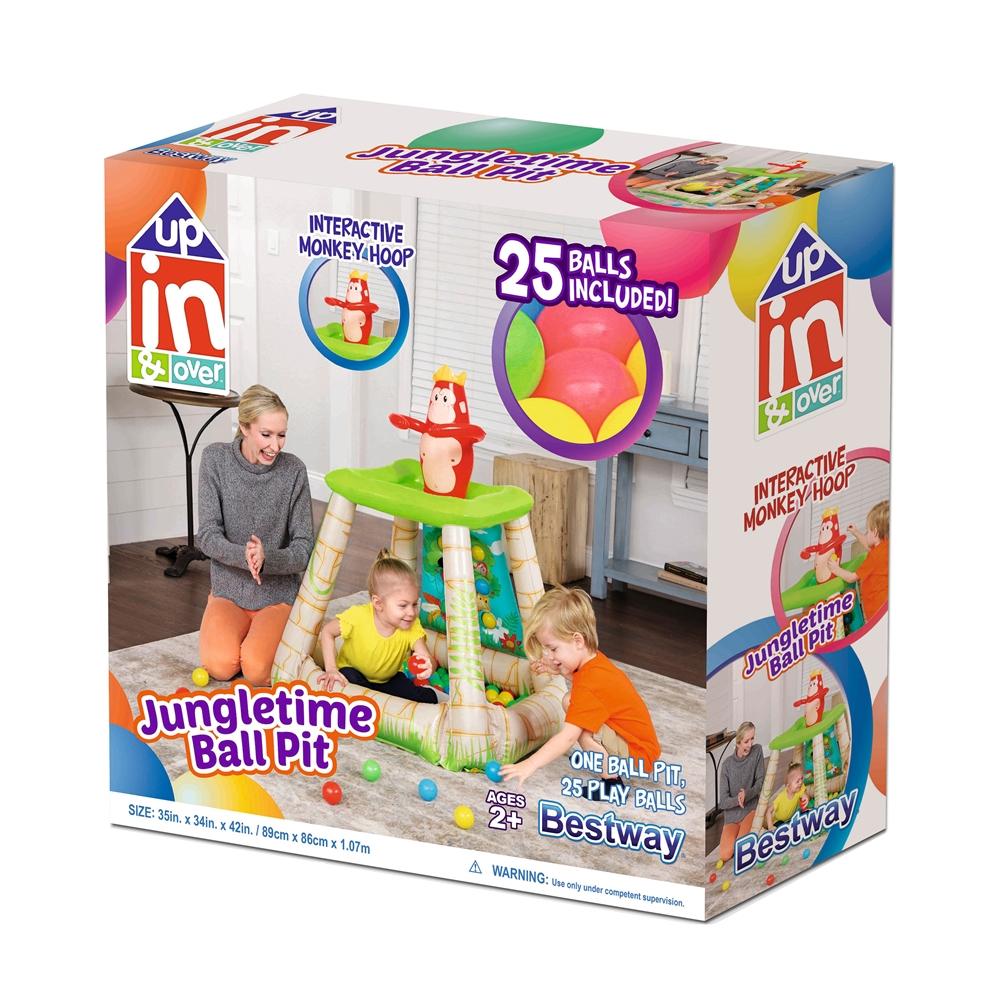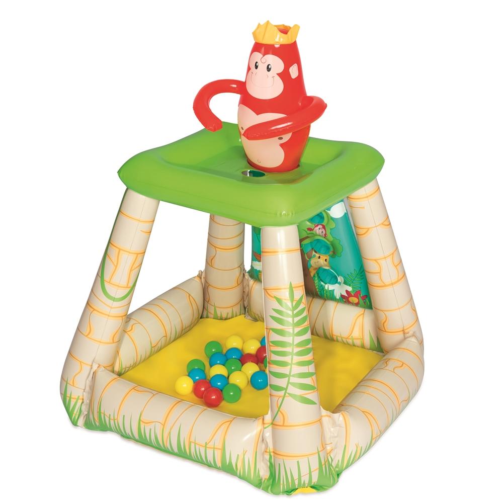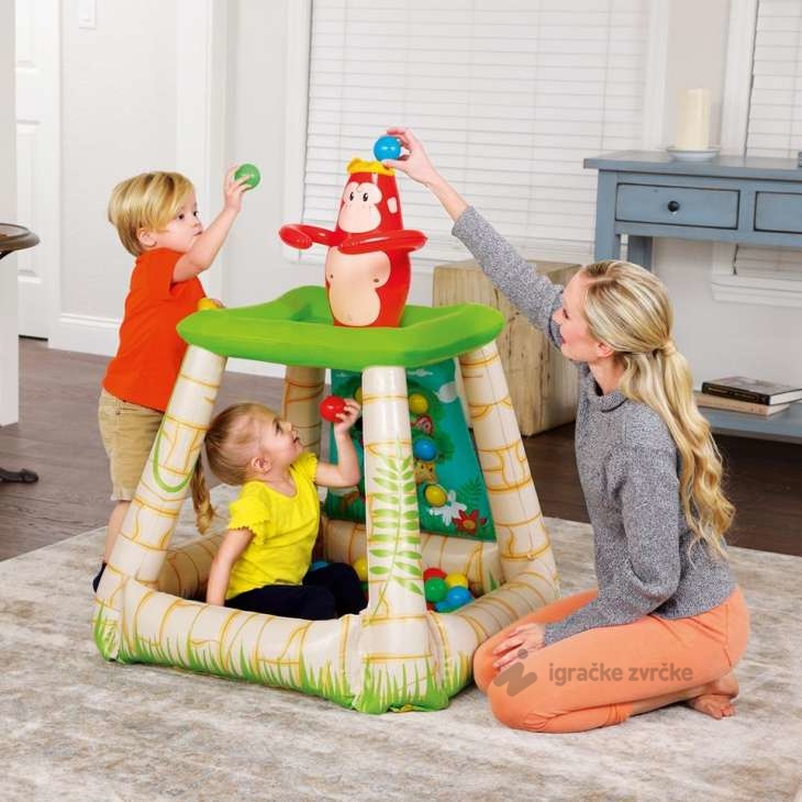 Dečija igraonica na naduvavanje dolazi sa 25 loptica za igranje. Poseduje bočne stranice na naduvavanje i nosače izrađene od čvrstog vinila dimenzija koji će izdržati beskrajne sate igranja. Majmun koji nosi kraljevsku krunu sedi na vrhu raširenih ruku da uhvati bačene lopte, koje zatim propadaju kroz ruku u igraonicu. Poseduje sigurnosne ventile za blokiranje naduvavanja i neželjenog izduvavanja. Dobićete jedan flaster za popravku koji olakšava popravljanje slučajne rupe ili pucanja na vinilu.