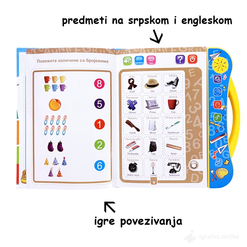 U ovoj knjizi, deca će otkriti interaktivne funkcije koje im pomažu da nauče osnove azbuke, brojeve, pojmove iz okoline, i mnogo više, na srpskom i engleskom jeziku. Osim toga, knjiga nudi niz igara i zadataka koji podstiču prepoznavanje pojmova, razvijajući pritom jezičke i kognitivne veštine.