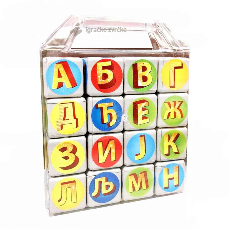 Kocke sa slovima Azbuke su sjajan način da se Vaš Zvrk zaigra i uči slova. Kocke sa slovima upoznaju Vašu decu sa prvim slovima, oblikom istih i zabavne su za sklapanje reči. Ove kocke su plastične sa samolepljivim nalepnicama. Dolaze u zgodnom koferu gde se mogu pakovati. Od kocki sa slikama možete napisati puno reči i imena. Proizvedeno u Srbiji. Preporučen uzrast 3+ godina.