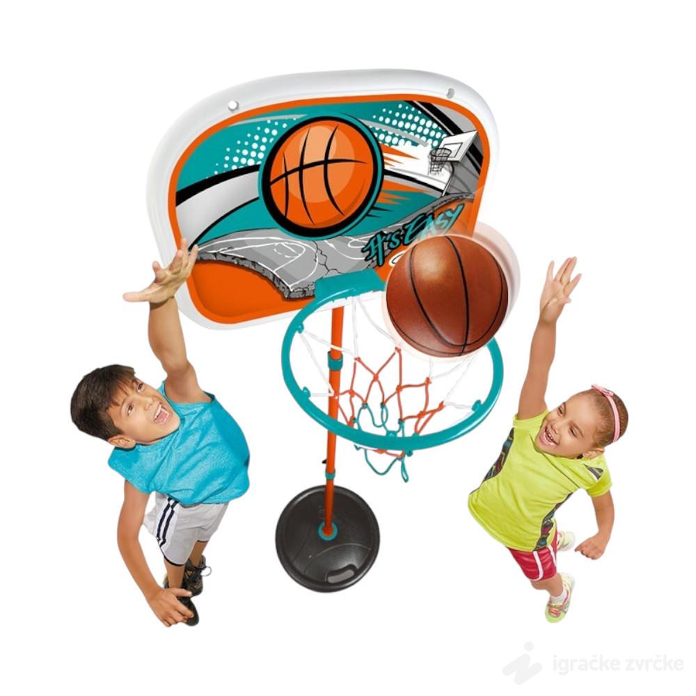 Koš za decu sa postoljem i tablom za aktivnost u sobi ili dvorištu. Koš ima tri visine i može se podešavati u zavisnosti od visine deteta. Baza postolja se puni peskom za dodatnu stabilnost. Uz koš sa postoljem dobijate i tablu, mrežicu i loptu. Savršena sportska igračka za samostalnu ili zajedničku igru.