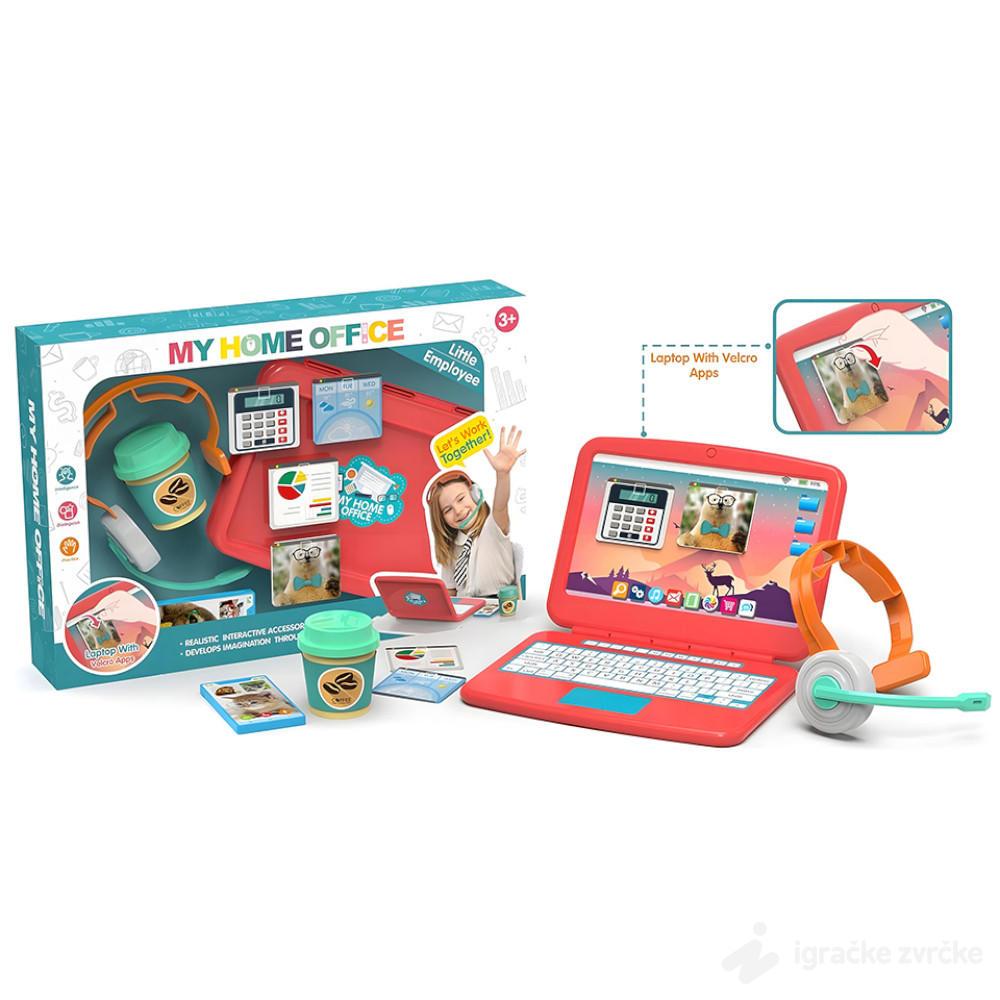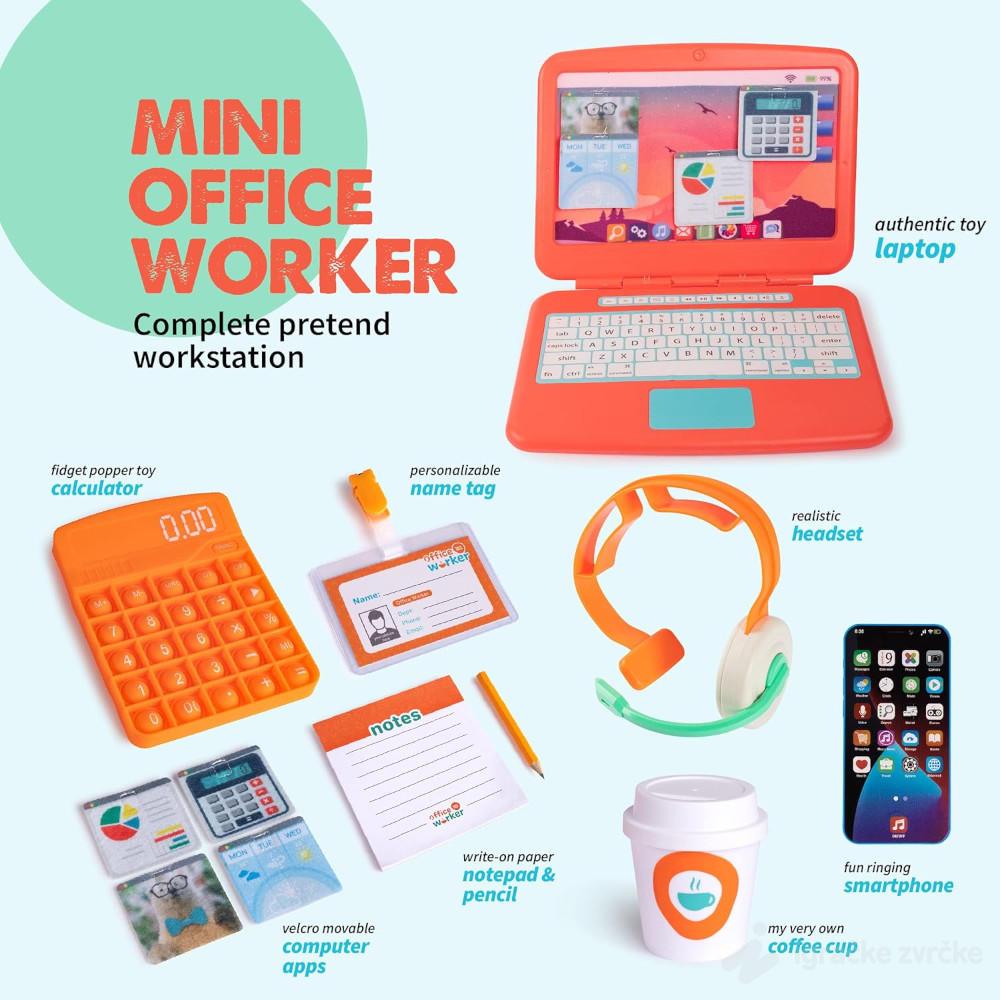Sa simpatičnim laptopom, pomerljivim aplikacijama na čičak, slušalicama, pop-it kalkulatorom, blokčićem i olovkom, mališani dobijaju kompletno radno okruženje koje ih uvodi u svet odraslih, ali na zabavan i bezbedan način.
