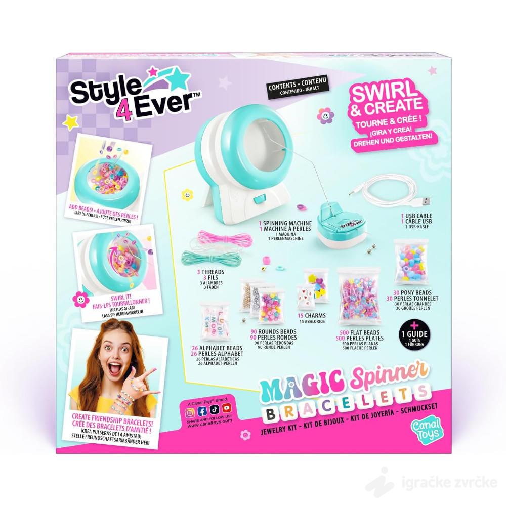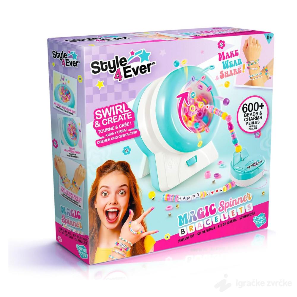 Magic Spinner Bracelet je kreativni set koji deci omogućava da uz pomoć specijalne mašine brzo i lako prave narukvice, ukrase i priveze pune šarenih perli.