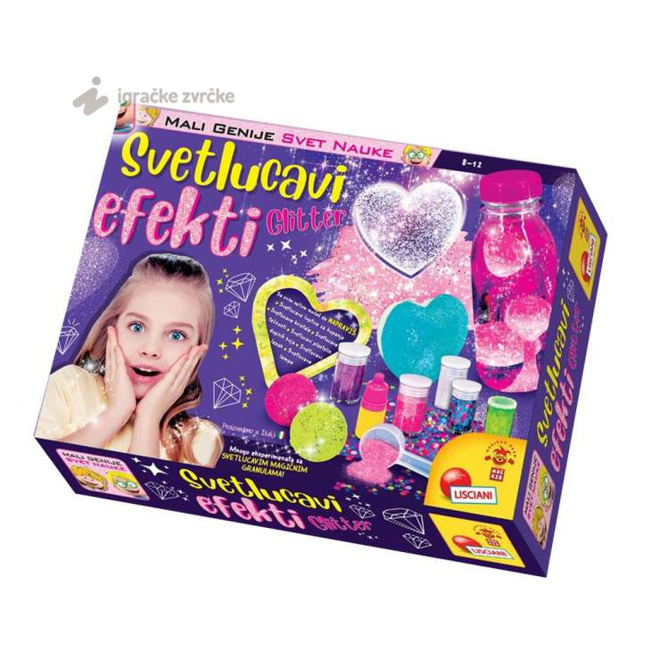 Mali Genije Laboratorija Glittera edukativna igra na srpskom jeziku za pravljenje neverovatnih glitter efekata! Glavni sastojci ove originalne laboratorije su male "svetlucave granule" koje ukrašavaju sve što dodirnu. Sa ovim specijalnim kompletom moći ćeš da izvedeš mnogo zabavnih svetlucavih eksperimenata! Svi sastojci su potpuno bezbedni za igru i korišćenje. Ovakvi kreativni setovi za devojčice su sve popularniji i biće savršen poklon za svaku priliku.