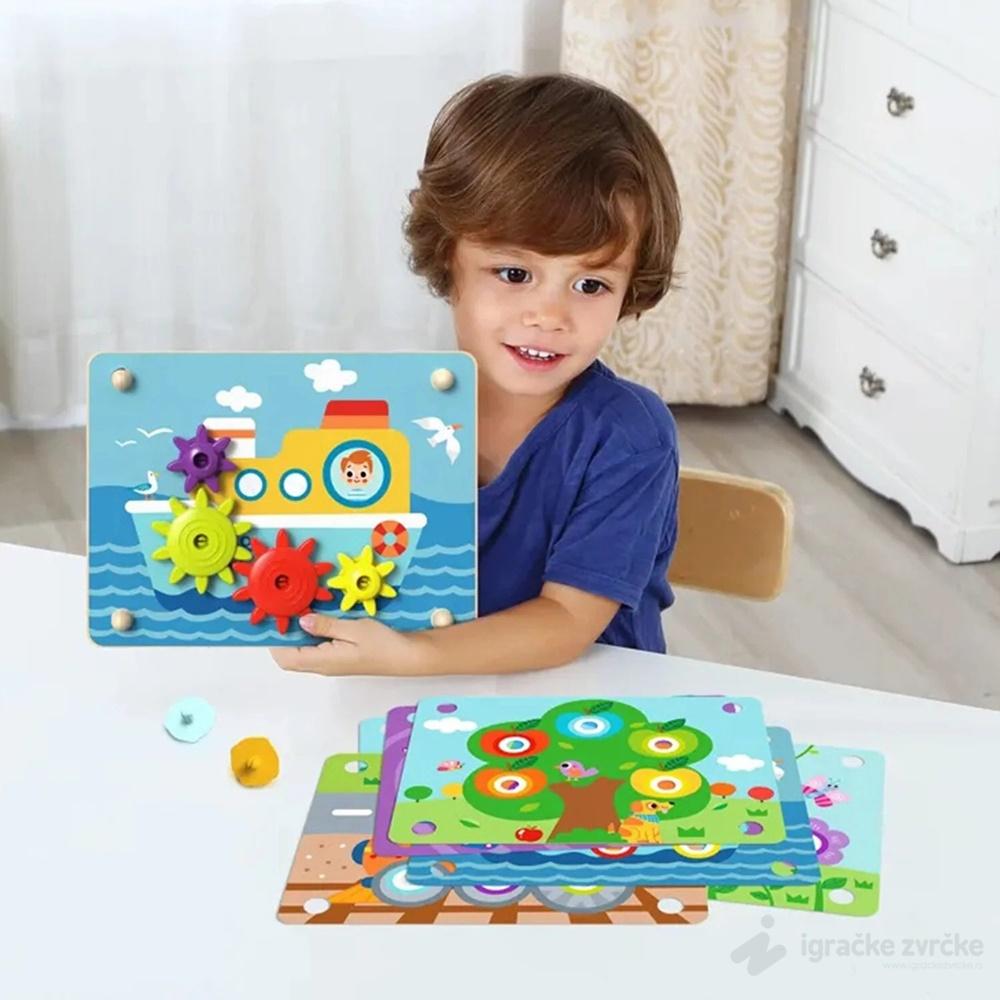 Montesori edukativna igra 6u1 ZUPČANICI će takođe podstaći fine motoričke veštine, istovremeno promovišući rasuđivanje i rešavanje problema dok deca stvaraju pokretne eksperimente sa rotirajućim, šarenim akcijama. Pogodno za decu uzrasta od 18+ meseci. Sadržaj: 6 okretnih zupčanika, 6 slika koje se mogu okretati i drvena podloga za klinove.