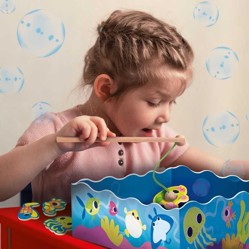 Rukovanje predmetima je jedinstveno iskustvo za čulo dodira, koje ostavlja neizbrisiv trag u dečijem umu. Na ovaj način dete uči i razvija svoju inteligenciju na osnovu iskustva. Delovi su veliki i pogosdni za male dečije ruke. Vaše dete će biti jako srećno kada suspešno ulovi ribice i uklopi na tablu.