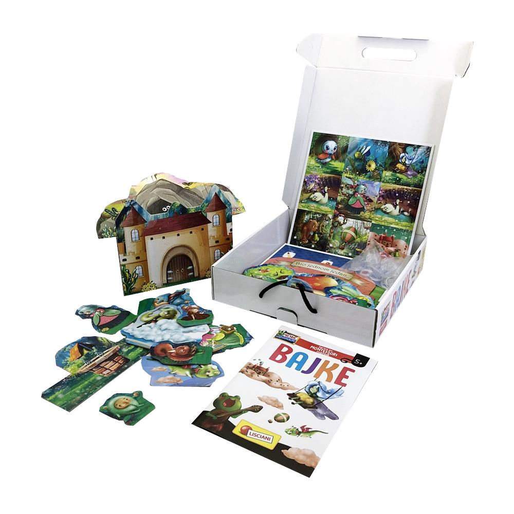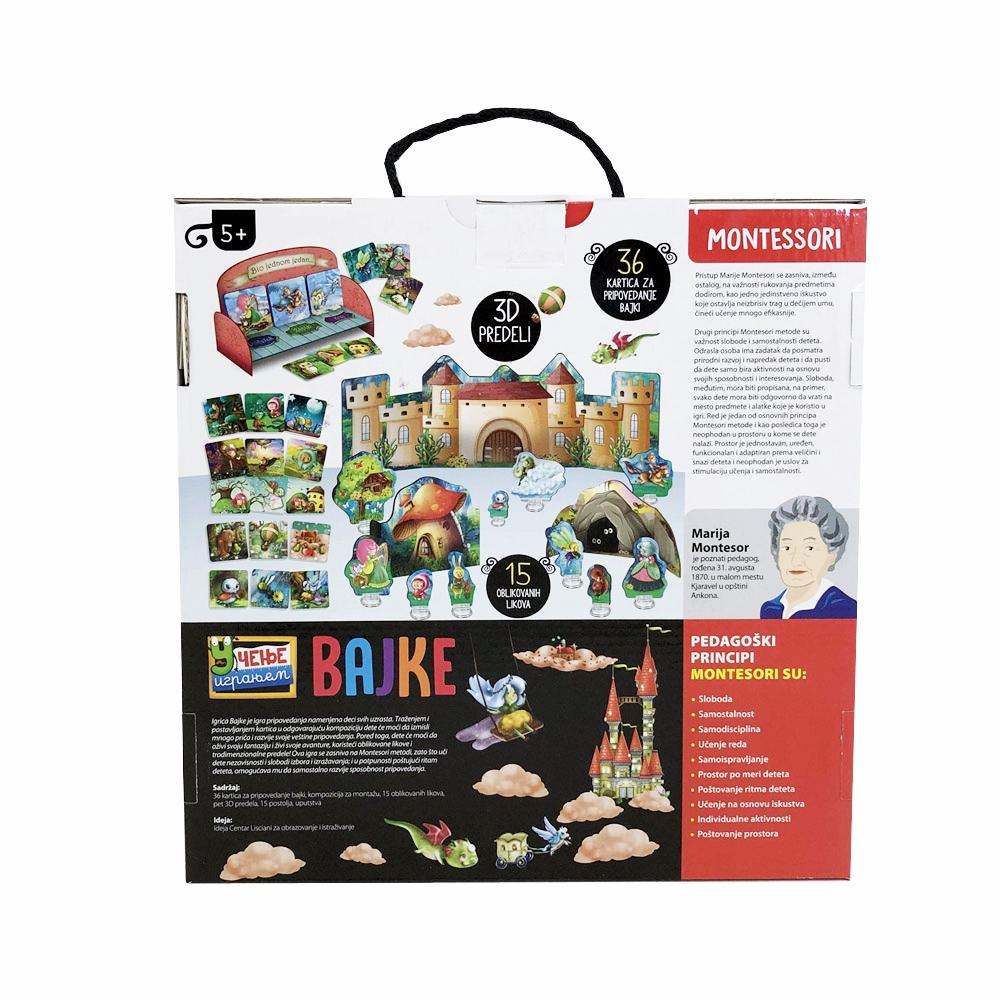 Ova Montesori kreativna igra pripovedanja Bajke namenjena je razvoju mašte, govora i veštine pripovedanja. Uzimajući kartice i postavljajući ih u bazu, dete razvija priču i nove likove, njihove odnose i glasove. Na ovaj način, vežbaju se narativne sposobnosti detata, govor kao i mašta.
