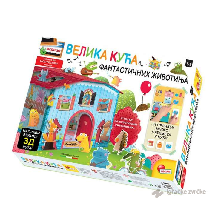 MONTESSORI Velika Kuća Fantastičnih Životinja je nov set iz Montesori serije edukativnih igračaka. Ova velika Montesori kuća pruža mnogo načina igre i vežbanje različitih veština. Kada sklopite kuću imate zadatak da ubacite unutra životinje kroz posebne otvore. Takođe, kada skinete krov možete se igrati potregae uz pomoć posebnih kartica sa slikama predmeta.