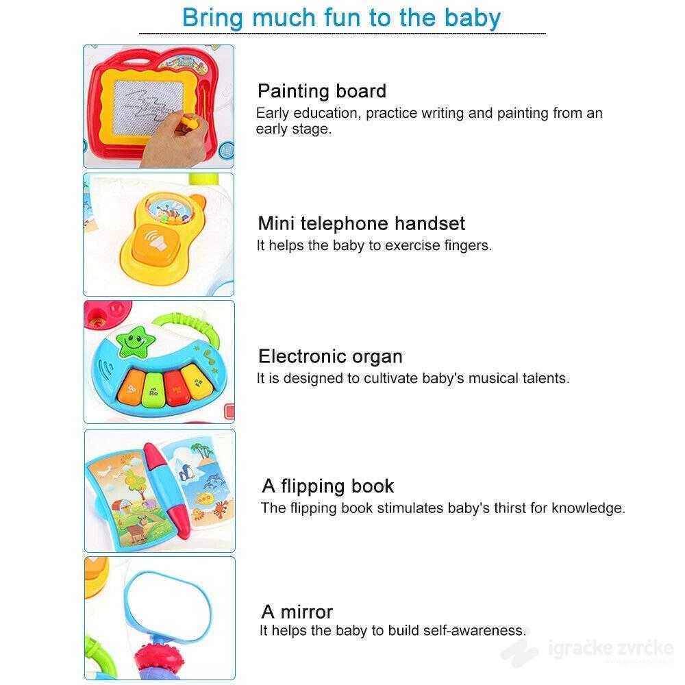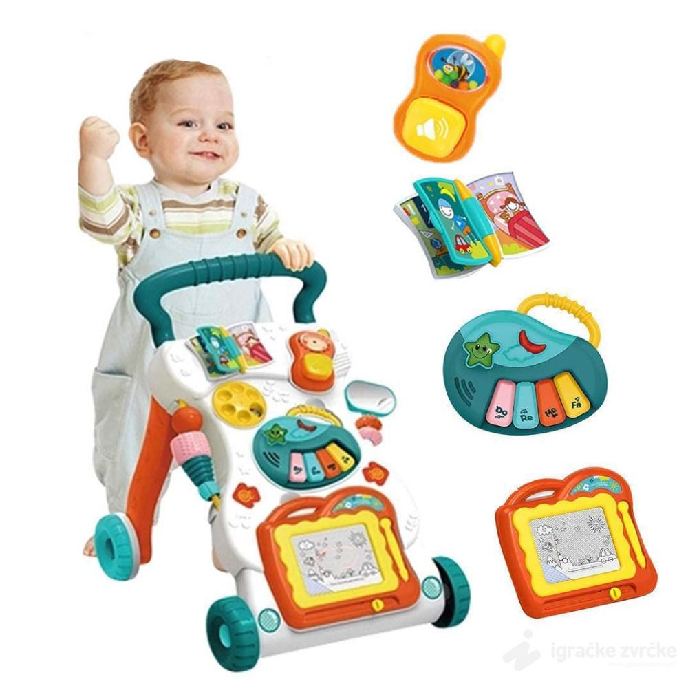 • Hodalica na sebi ima igračke koje vežbaju motoriku i razne veštine (piši-briši tabla, telefon, knjižica,..)