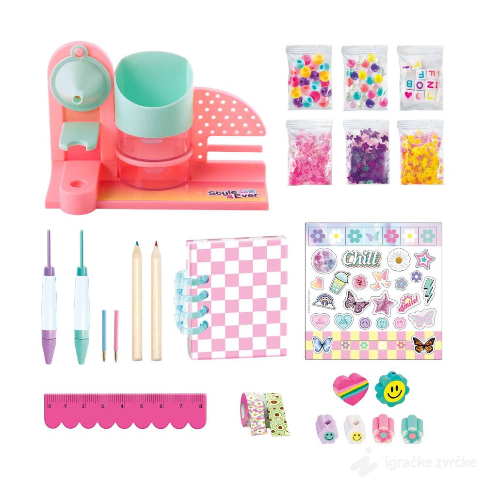 NAPRAVI SVOJ PRIBOR - Kreativni set ima sve što vam je potrebno da napravite svoj kancelarijski materijal. Izaberite jednu od svojih „uradi sam“ olovaka i napunite je ukrasima za kul efekat, a zatim ukrasite perlama i slatkim gumicama različitih oblika! Možete dodati traku i gumice da ukrasite svoje bojice i koristiti ih za pisanje ili crtanje u priloženoj mini svesci! Uključeno je i mnoštvo nalepnica za personalizaciju vaših zapisa u svesci, tako slatko. Uzrast od 6 godina.