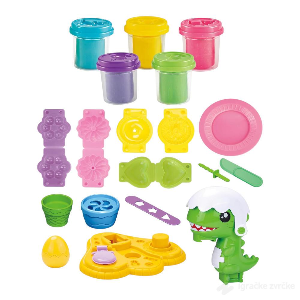 Dete može da koristi različite boje plastelina, kalupe i dodatke kako bi pravilo kolače, sladolede i razne oblike, dok dinosaurus dodaje element iznenađenja „praveći“ figure.