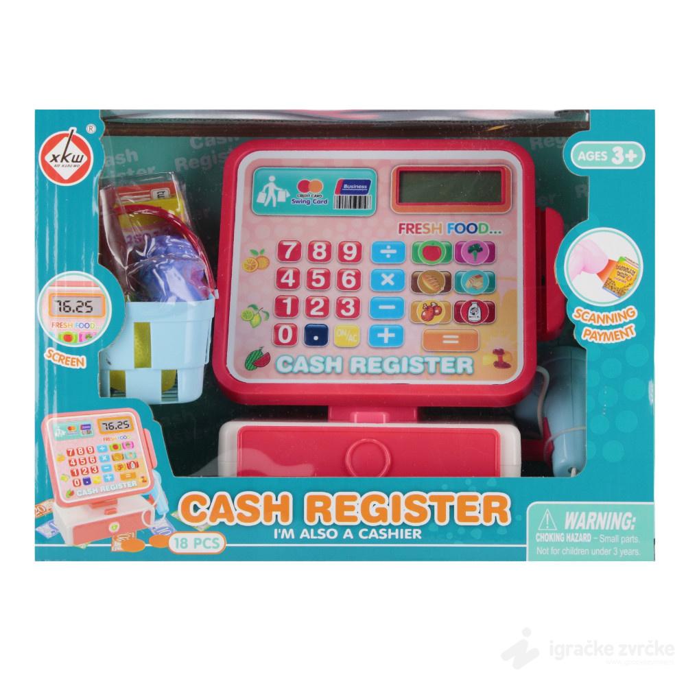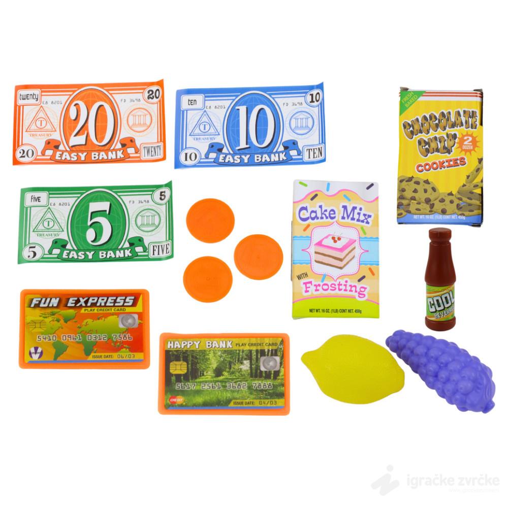 • Kasa dolazi u kutiji sa puno dodataka: novcem za igru, pakovanjima proizvoda, barkod čitačem...