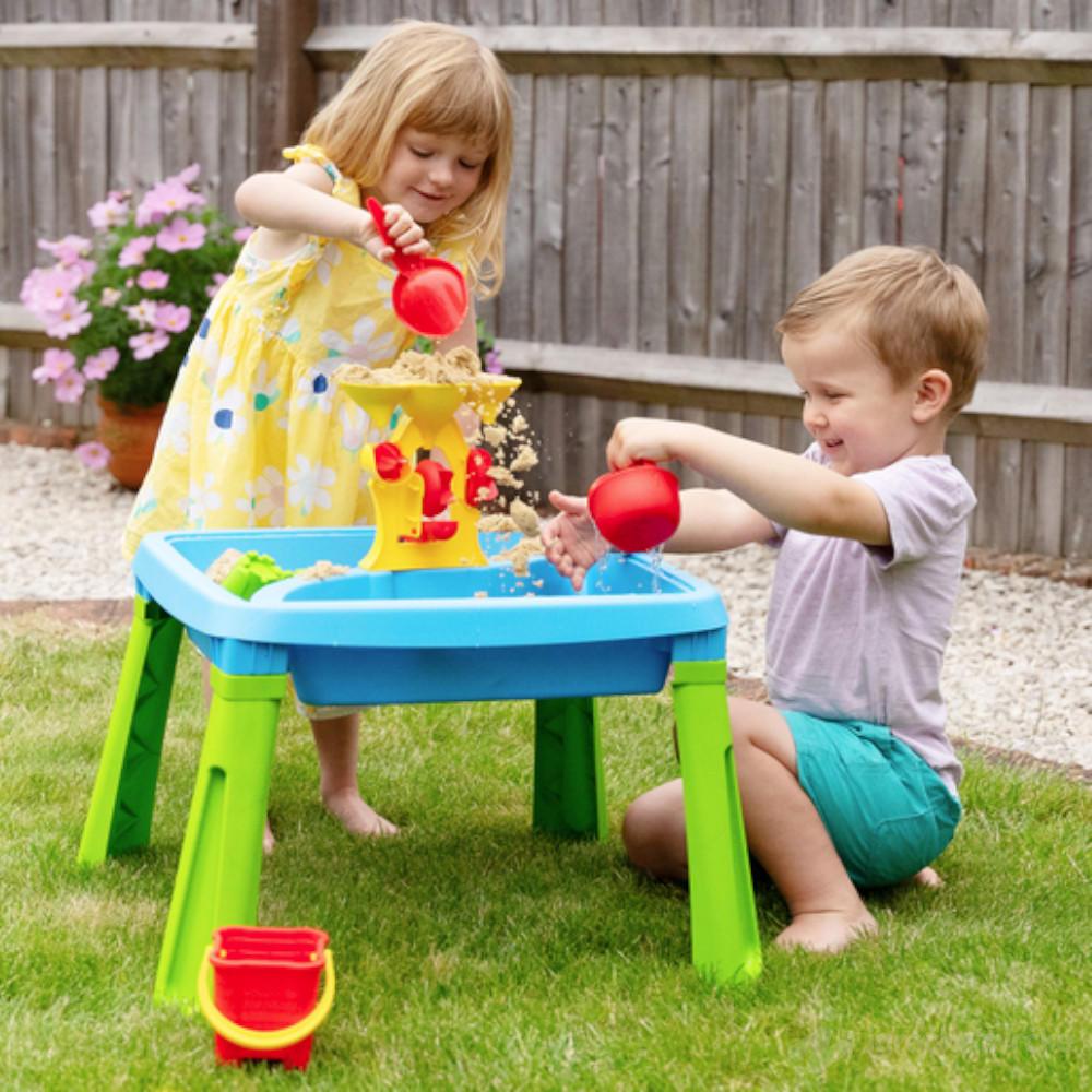Ovaj 3u1 sto za igru predstavlja savršenu kombinaciju zabave i učenja. Deca mogu uživati u igri sa vodom, praviti male tokove uz pomoć levaka i točkića, ili koristiti drugi deo za igru sa peskom.