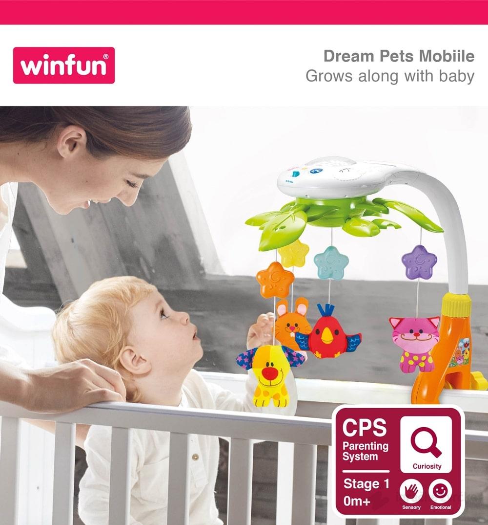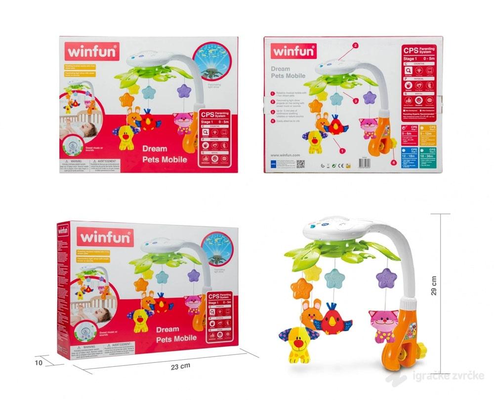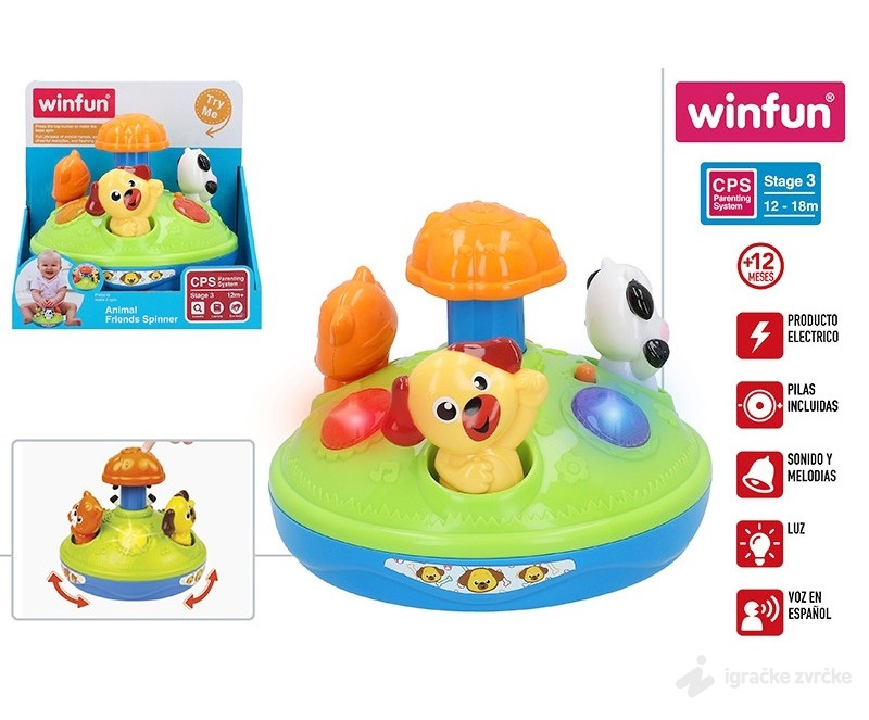 Ova Win Fun Igračka na pritiskanje koja se okreće poseduje razna šarena svetla i melodije. Ovo dodatno stimuliše bebu da se igra i pritiska delove.