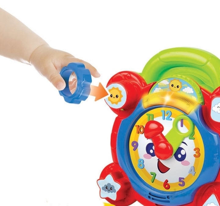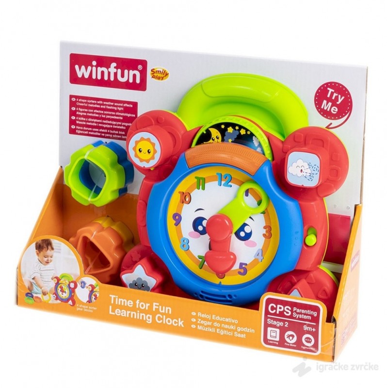 MULTIFUNKCIONALNA IGRAČKA Win Fun igračka za bebe VESELI ČASOVNIK je igračka koja nudi nekoliko načina igre. Sat ima kazaljke koje se mogu pomerati i na taj način će dete kroz igru naučiti kako da gleda na sat. Četiti baze za slaganje oblika podstiču igru rukama i razmišljanje. Disk se vrti i pokazuje dan i noć.